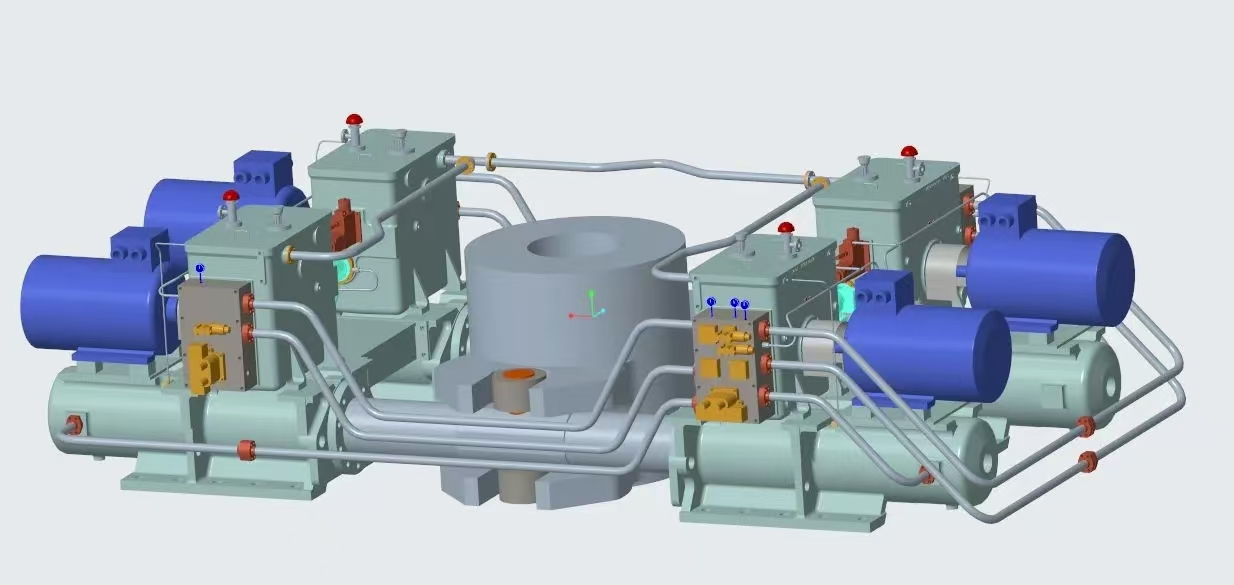 17000TEU雙燃料集裝箱船是綠色新能源船舶的典型代表,武漢船機為該船提供的舵機型號為FE42-1150-T050,最大工作扭矩可達11280kN·m,最大轉(zhuǎn)舵角度為37度,單臺舵機配備的四套動力系統(tǒng)為雙柱塞四油缸拔叉式舵機結(jié)構(gòu),具有系統(tǒng)性集成度高、可靠性高、性能優(yōu)等特點。